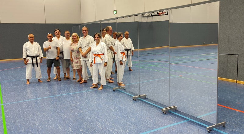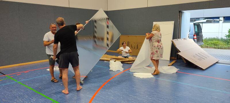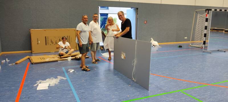 13.08.2025: Aufbau der portablen Spiegelwand für den Trainingsbetrieb. Danke an unsere Spenderin Maria.
